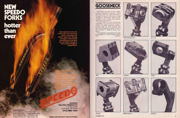 A gooseneck shootout was a common thing back in these days. Cool to see the changing styles and the evolution of the stem design. And of course there is Schwinn bringing up the rear and sticking with the single clamp design. And not to forget the clean look of those Tuff Neck stems. No wonder they were so popular. And I am not going to touch that Speedo fork ad. Too easy.